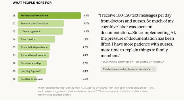 这也是为什么,Anthropic 在 2026 年 3 月 18 日发布的《What 81,000 People Want from AI》会那么戳人。因为它没有再往上空飘,而是把问题拉回来了:AI 到底被普通人拿来干什么?他们真正希望它帮什么忙?他们又在怕什么?Anthropic 使用的是一个定制的「AI 访谈者」,由 Claude 模型驱动,在全球 159 个地区、用 70 种语言,和超过 8 万名 Claude 用户进行了一场深度交心。最重要的结论不是“效率最高”这种显而易见的话,而是那句几乎可以当作这个时代注脚的判断:人们希望AI 帮他们活得更好,而不只是工作得更快。