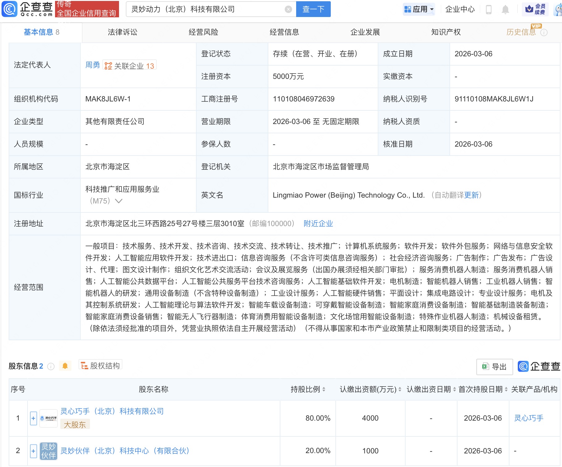 近日,灵妙动力(北京)科技有限公司成立,经营范围包含:智能机器人的研发;人工智能理论与算法软件开发;智能家庭消费设备销售;智能无人飞行器制造等。企查查股权穿透显示,该公司由灵心巧手(北京)科技有限公司等共同持股。