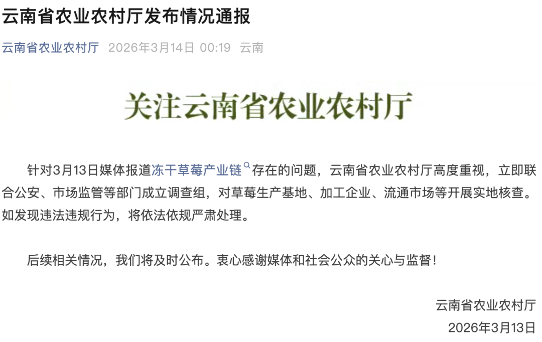 针对3月13日媒体报道冻干草莓产业链存在的问题,云南省农业农村厅高度重视,立即联合公安、市场监管等部门成立调查组,对草莓生产基地、加工企业、流通市场等开展实地核查。如发现违法违规行为,将依法依规严肃处理。 后续相关情况,我们将及时公布。衷心感谢媒体和社会公众的关心与监督!